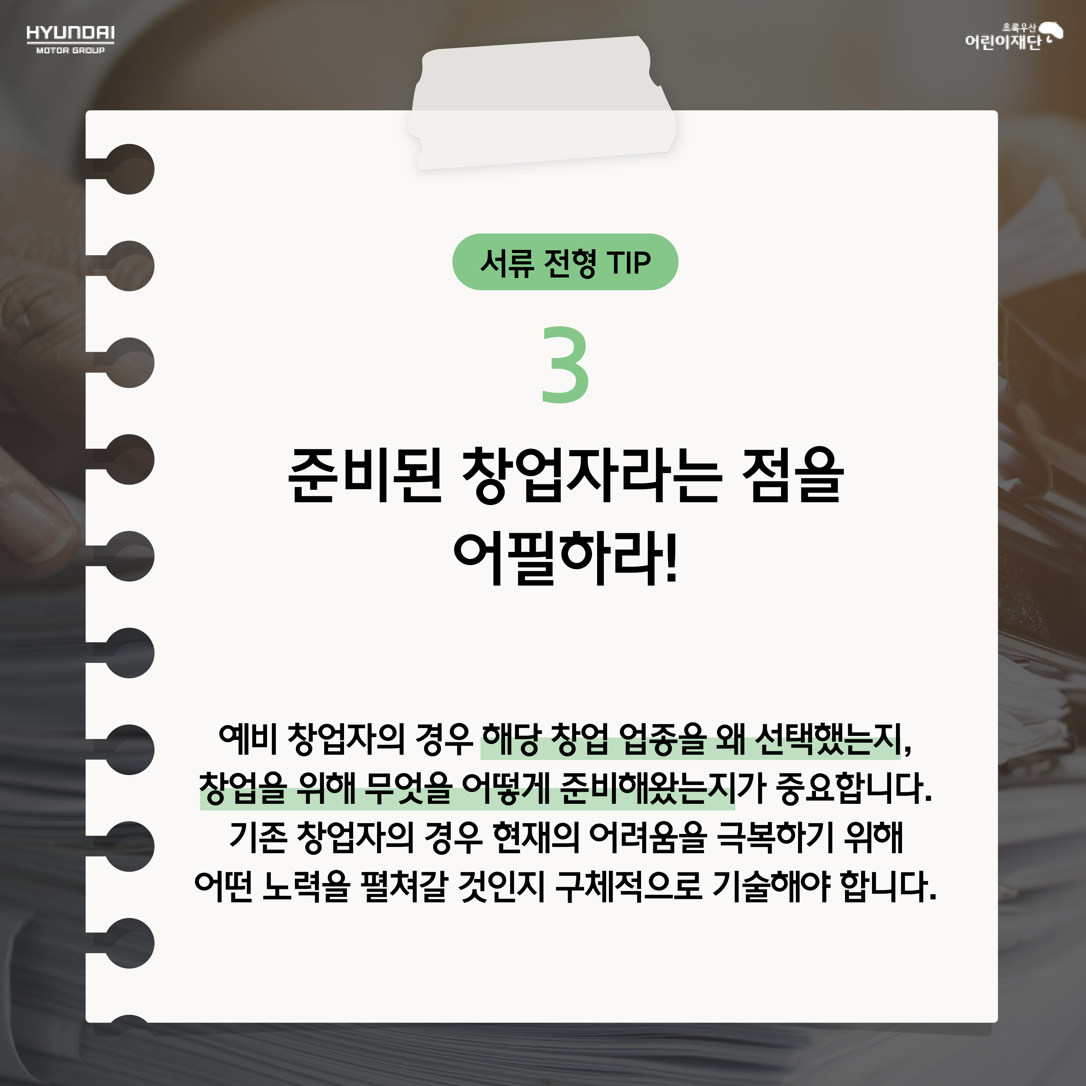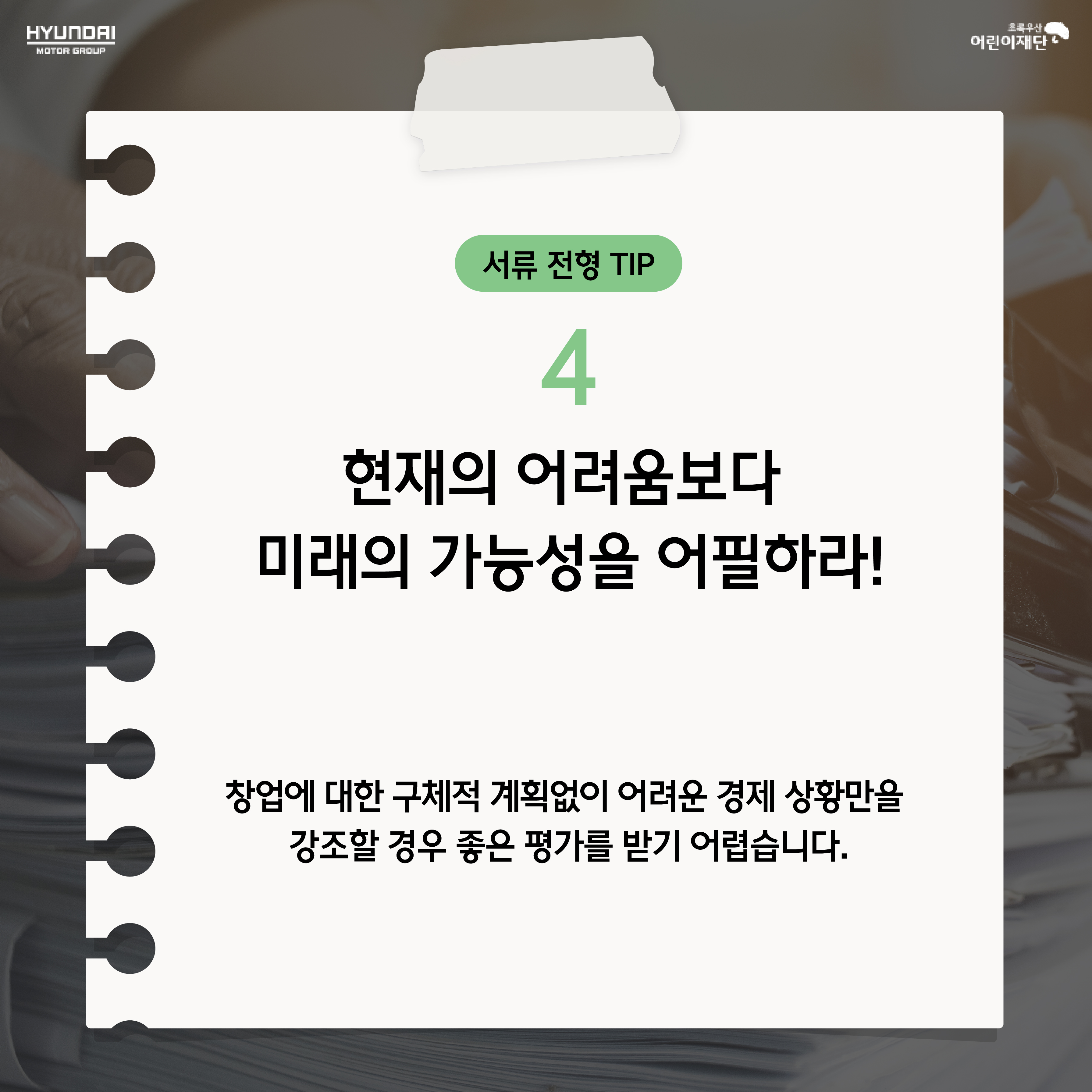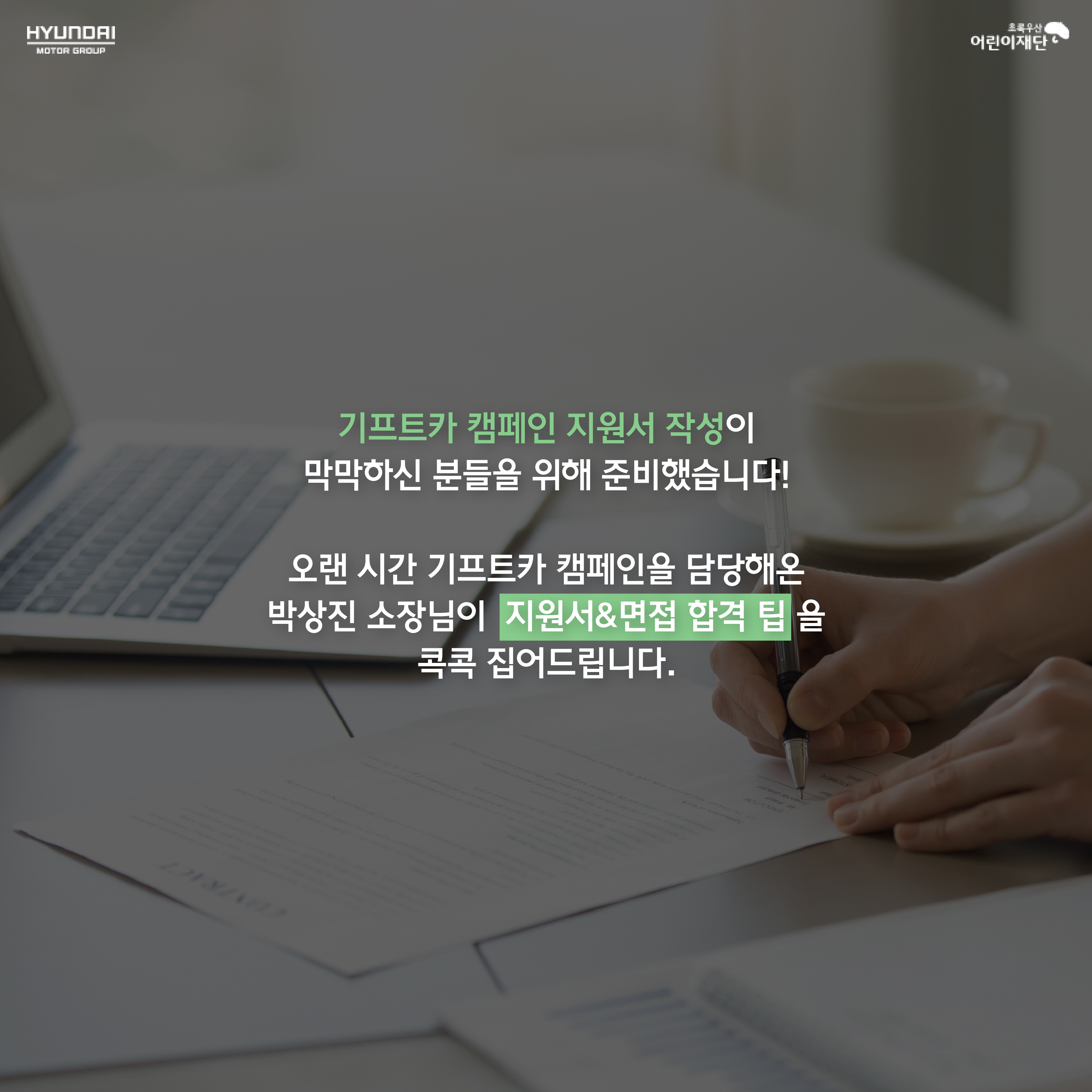 시즌10 [SPECIAL] 면접관이 알려주는 지원서 작성 팁 기프트카 캠페인에 지원하고 싶은데, 지원서 작성이 어려우신가요? 합격을 부르는 지원서 작성 팁을 면접관이 직접 알려드립니다! 2019-09-25 147343 40 기프트카 캠페인 시즌10는 2019년 9월 26일부터 2020년 2월 29일까지 지원 가능합니다.새로운 꿈과 열정을 가진 분들의 많은 지원을 기다립니다! #지원서작성팁 #합격꿀팁 #giftcar #gift-car #현대자동차그룹 #현대자동차그룹사회공헌 #기프트카 #기프트카캠페인 #시즌10 목록