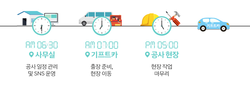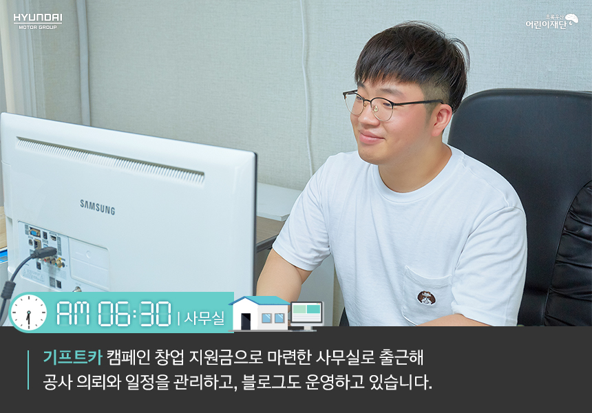 기프트카 캠페인 창업 지원금으로 마련한 사무실 겸 창고로 출근합니다. 전날 새롭게 들어온 공사 의뢰 내용을 확인하며 하루를 시작하죠. 일정 확인 후 시공 날짜를 조율하고, 전화나 카카오톡 오픈 채팅을 통해 고객과 사전 상담을 진행합니다. 이 과정에서 고객분들께 예상 견적이나 시공법에 대해 설명해 드리고 있습니다.