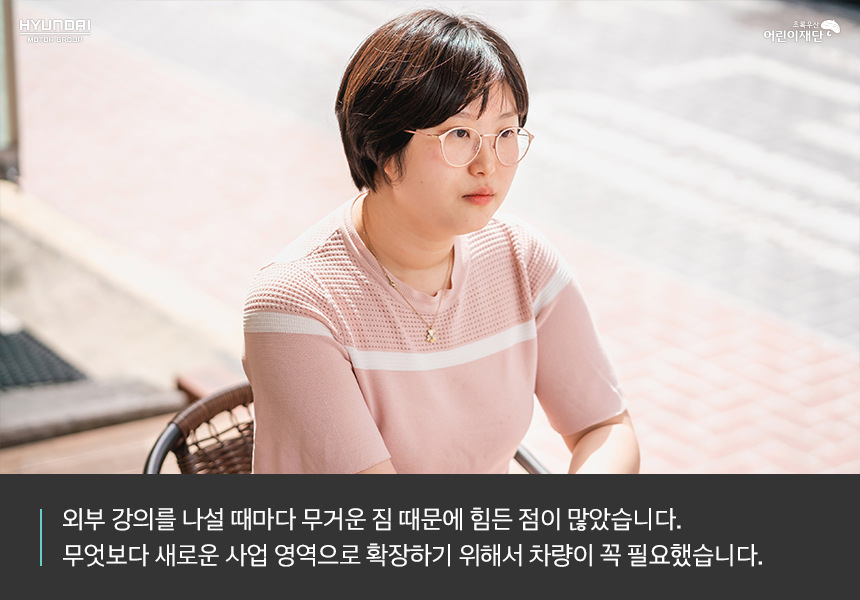 대중교통을 이용해 외부 강의에 나설 때면 불편한 점이 정말 많았습니다. 특히 수업에 필요한 수많은 재료와 도구를 직접 들고 이동하는 건 무척 힘에 부치는 일이었죠. 어쩔 수 없이 택배를 이용하기도 했는데, 강의 날짜에 맞춰 배송이 오지 않아 난감했던 경험도 있습니다. 상황이 이렇다 보니 장거리 이동은 꿈도 꿀 수 없었습니다.