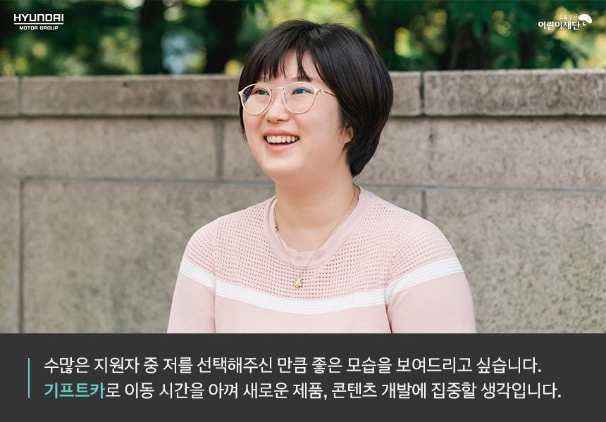 기프트카 덕분에 이동 시간을 단축할 수 있게 됐으니 제품, 새로운 콘텐츠 개발 등 사업에 더 많은 시간을 투자해볼 생각입니다. 무엇보다 상상만 했던 새로운 사업 계획들을 차근차근 실행해 나갈 생각에 벌써 마음이 설렙니다.