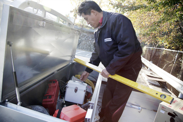 [차량 공구함 안에 작업 도구를 싣고 있는 이근우 씨]