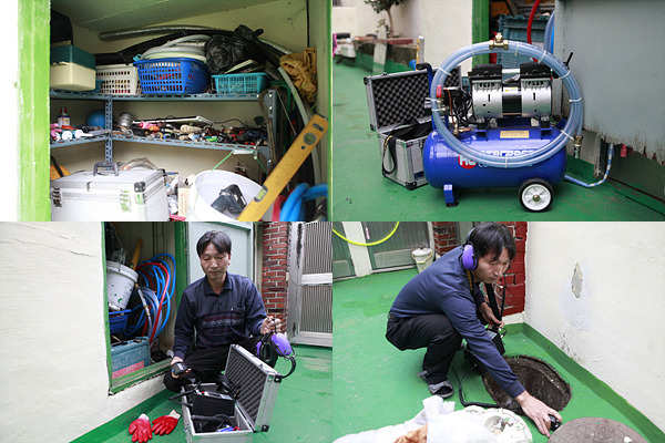 [창고 가득 보관된 누수탐지 장비들(위) / 작업 중인 이건봉 씨의 모습(아래)]