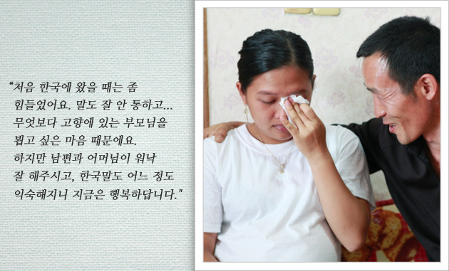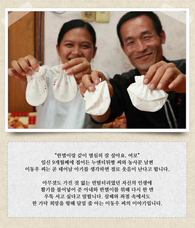 아내 누엔티튀짱 씨는 워낙 적응력이 좋고 눈치가 빨라, 말이 안 통할 때도 몸짓 눈짓으로 말을 잘 알아들었다고 합니다. 남편을 통해 실생활에서 사용하는 단어들을 배우기 시작했고, 복지관에서도 한글을 배우며 빠르게 적응해갔습니다. 처음 낯선 땅에 시집와 매일같이 눈물로 밤을 지새우던 꽃띠 처녀의 모습은 이제 어디에서도 찾아볼 수 없었습니다. 오히려 곧 태어날 한별이(출산 예정인 아이의 태명)와 함께 행복한 가정을 꾸릴 생각에 설레는 마음으로 하루하루를 보내고 있습니다.