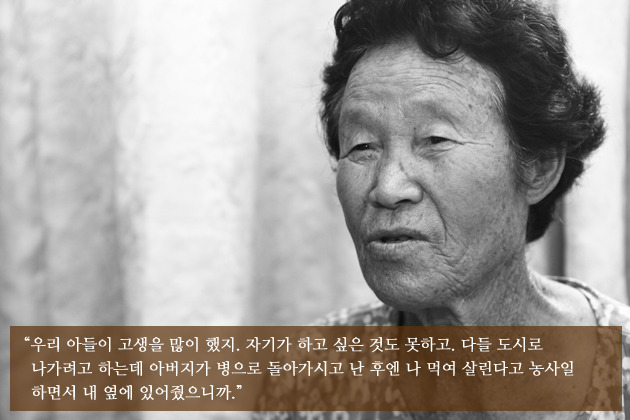 효자 아들 이야기만 하면 입에 침이 마르도록 칭찬을 늘어놓으시는 87세 문순늠 할머님. 귀가 어둡긴 하시지만 아직도 고추 밭, 마늘 밭에 나가 일을 하실 정도로 정정하십니다.