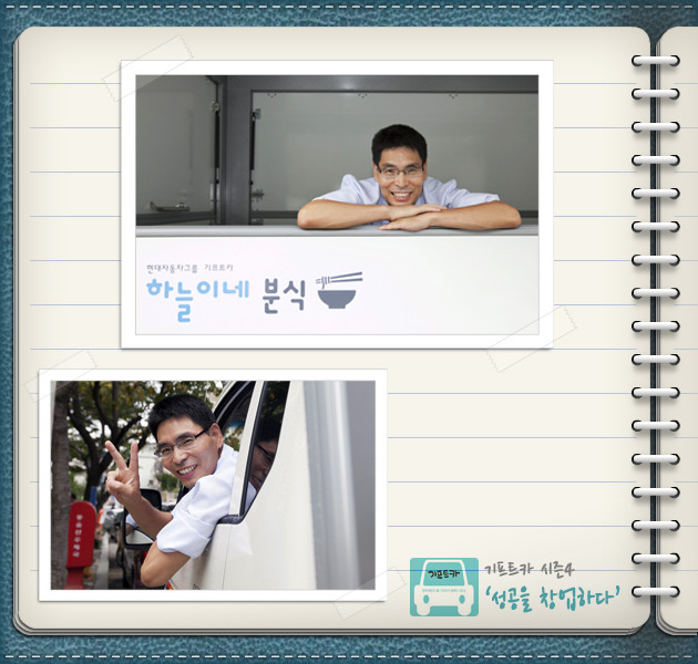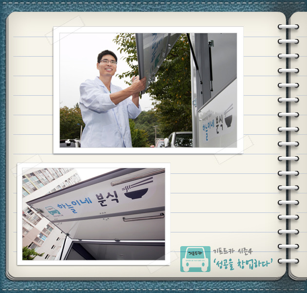 최종국 씨는 창업컨설팅을 통해 만들어 주신 상호 ‘하늘이네 분식’을 좀 더 크고 잘 보이게 할 생각이라고 합니다. 또한, 내부에 목조인테리어를 할 생각이신데요. 그동안 기프트카 운영을 위해 모아 둔 돈과 기프트카에서 받은 창업자금을 합하면 멋진 이동분식카를 만들 수 있을 것 같다고 하십니다. 멋지게 변신한 하늘이네 분식 기프트카 벌써부터 궁금해지네요~