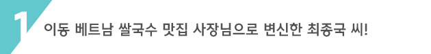 최종국 씨: 울산엔 거리에서 쌀국수를 파는 곳은 없어요. 낯선 외국음식이지만 우리 입맛에 맞는 놋그릇을 준비해서 따뜻하게 먹을 수 있도록 준비했습니다. 제가 색소폰을 연주할 줄 아는데 손님들의 이목을 끌기 위해 틈틈이 연습하고 있고요. 새벽까지 지친 택시기사 분들께는 할인쿠폰을 드려 더욱 저렴한 가격에 부담 없이 식사하러 올 수 있는 곳으로 만들어보려고 합니다. 또한, 무료 시식 쿠폰을 단골손님들에게 주어 가족과 함께 나들이 올 수 있는 그런 곳으로 만들려고 합니다.