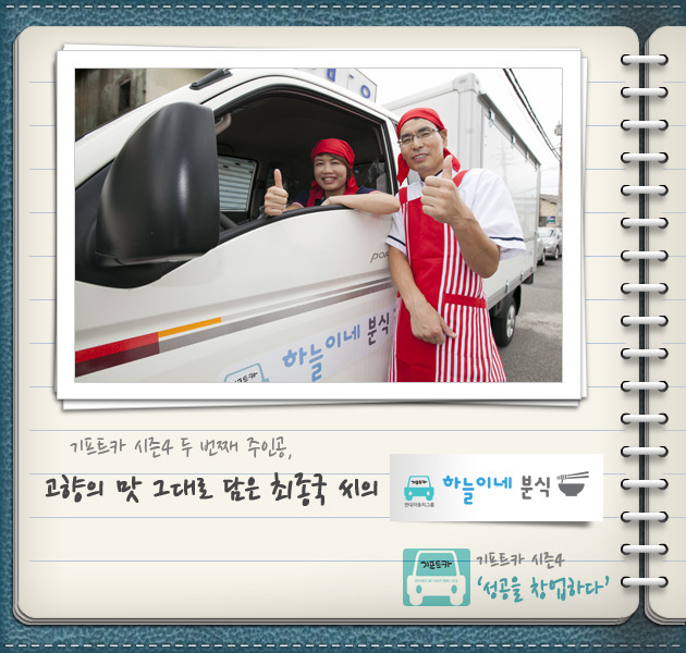 하늘이는 상호를 볼 때마다 쑥스럽지만 기분이 좋다며 아버지가 자랑스럽고 의지가 된다고 말하는데요. 이런 하늘이의 모습을 보며 최종국 씨는 멋진 아버지로, 믿을 수 있는 남편으로 살수 있는 마지막 기회라고 생각하고 열심히 살겠다고 약속하셨습니다. 최종국 씨의 하늘이네 분식이 울산 최고의 명가로 탄생할 수 있도록 기프트카가 함께 응원할게요~