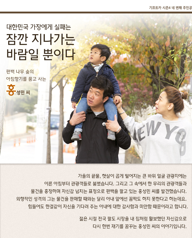 언제나 말없이 기다려주었던 아내와 아들 지우를 생각하며 선택한 사업 아이템은 편백 제품이었습니다. 피톤치드가 가득한 편백 제품을 주력으로 판매하며 가족에게도 상쾌한 편백 숲의 아침향기를 전해주고 싶다는 홍성민 씨는 전국 팔도 관광지를 돌며 자신감 넘치던 그때로 돌아갈 준비를 마쳤습니다.