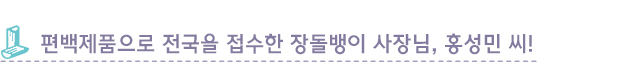 홍성민 씨: 처음엔 상호를 듣자마자 ‘총각? 난 유부남인데.’ 하고 생각했죠. 그런데 사업가적인 측면에서 접근해보니 제가 늘 중요하게 생각했던 활기찬 에너지와 총각이라는 단어가 잘 매치되더라고요. 손님 중에는 젊은 총각이 파는 물건이니 하나 더 팔아주자며 사가시는 분들도 있거든요. 일하면서 마음만은 늘 총각처럼 젊고 기운차게, 열심히 사업해볼 생각입니다.
