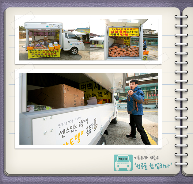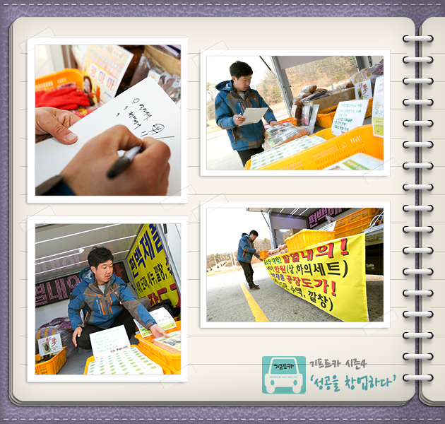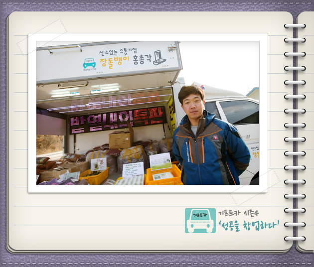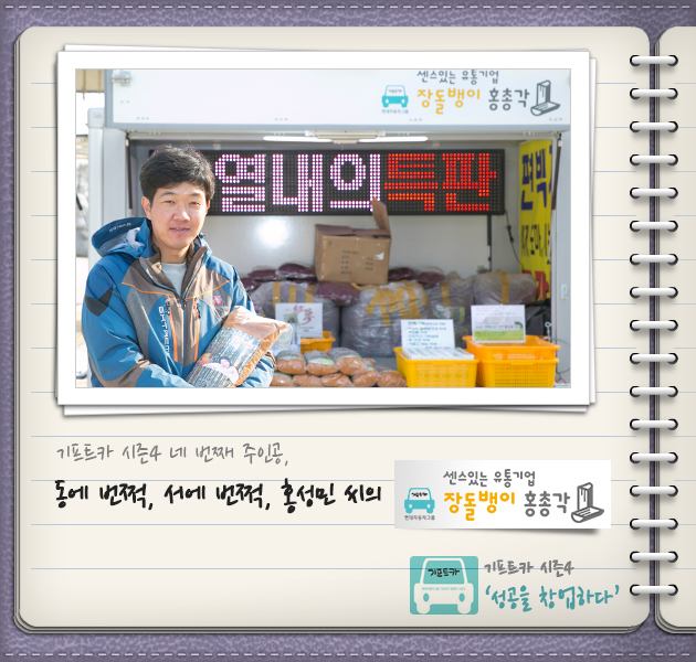 홍성민 씨: 네~ 아주 잘 되고 있습니다. 기프트카를 받기 전부터 차량 인테리어와 판매전략을 열심히 생각해뒀거든요. 그래서 받자마자 내부를 꾸미고 바로 판매를 하러 나갔죠. 예상대로 구경을 하러 오는 손님들도 많았고, 그날은 물건 판매도 제법 됐습니다. 출발이 아주 좋았어요. 이제 기프트카로 더 많은 매출을 올리는 일만 남았습니다!