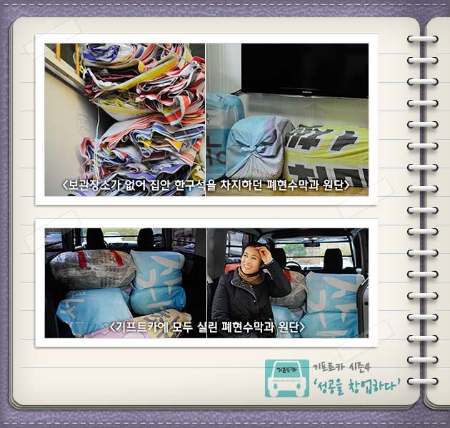 기프트카를 받은 후에 달라진 것 중 빼놓을 수 없는 것이 있습니다. 바로 짐을 실을 수 있는 공간이 생겼다는 것입니다. 방안에 날리는 먼지로 딸의 건강이 언제나 걱정되었던 최은옥 씨는 기프트카를 받자마자 집안에 있는 자투리 천과 폐 현수막 등을 차로 옮겼다고 하는데요. 250kg까지는 거뜬하게 실을 수 있기 때문에 믿고 맡길 수 있는 창고가 하나 더 생긴 기분이라고 합니다.