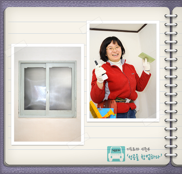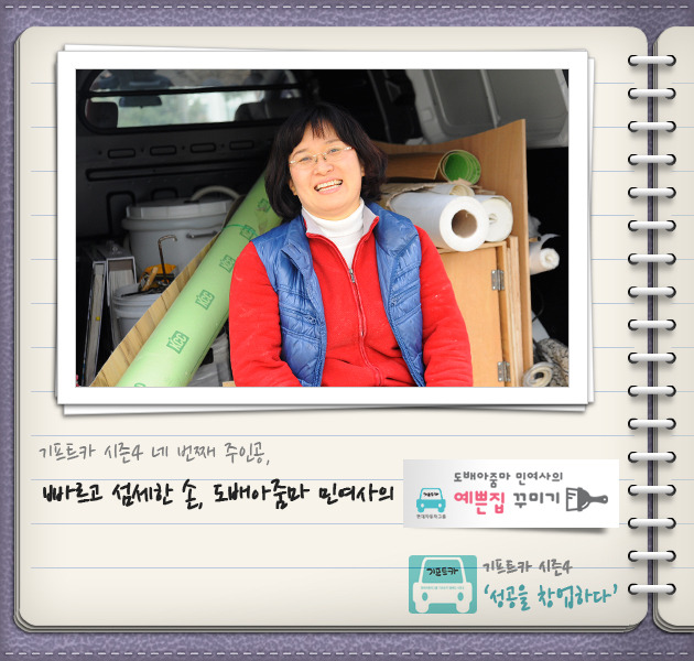얼룩덜룩한 벽지를 뜯어낸 자리에 새하얀 벽지를 붙이고 나면 왠지 모든 것이 새롭게 시작되는 것 같다는 민옥선 씨. 그녀는 도배를 통해 후회와 미련으로 쌓인 지난 세월의 상처들을 깨끗이 비워낼 수 있었다고 합니다. 그리고 지금은 그 빈자리를 감사함과 희망으로 채워나가고 있고요. 이제 민옥선 씨는 방금 바른 깨끗한 벽지처럼 기프트카와 함께 다시금 세상에 나섰습니다. 빠른 손, 섬세한 기술로 인기 만점인 민옥선 씨의 ‘도배아줌마 민여사의 예쁜집 꾸미기’를 소개합니다.