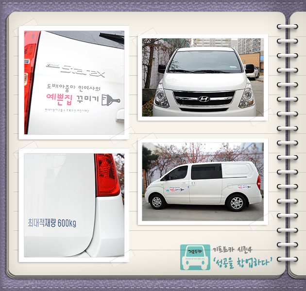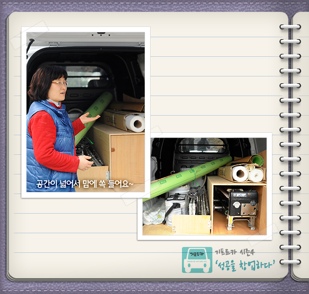 민옥선 씨: 네, 바로 일을 시작할 수 있도록 필요한 도배 자재와 장비들을 샀어요. 내비게이션이랑 블랙박스도 설치하고, 장비를 기프트카에 안정적으로 싣고 다닐 수 있도록 틀도 짜 넣었어요. 이렇게 며칠 동안 정신 없이 다니면서 준비한 덕분에 바로 일하러 갈 수 있었죠!