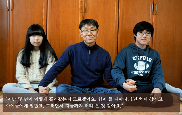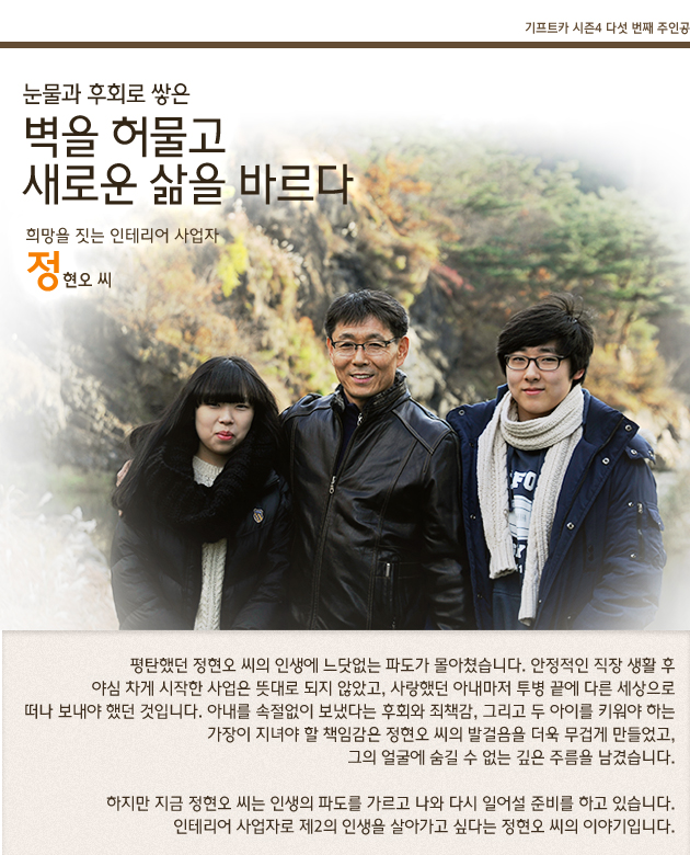 사업실패와 아내의 오랜 병원생활로 자금이 바닥 난 정현오 씨는 아이들과 먹고 살기 위해 무작정 복지기관을 찾았습니다. 복지기관을 통해 지역자활센터의 집수리 일을 소개받은 정현오 씨는 적은 돈이지만 정기적인 수입을 얻을 수 있었고 생활도 점차 안정되어갔습니다. 특히 아이들에게 엄마의 빈자리를 느끼게 해주고 싶지 않아 함께 많은 곳을 다니며 추억을 쌓아갔다고 합니다. 그렇게 두 아이는 정현오 씨에게 열심히 살아가야 하는 이유가 되어주었습니다.