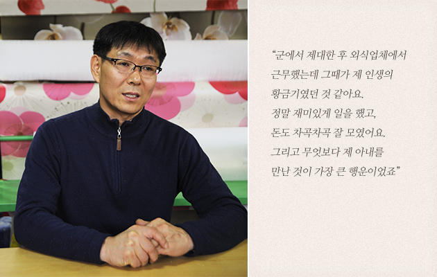 그렇게 풋풋한 만남을 이어오던 두 사람은 많은 사람의 축복 속에 결혼식을 올리게 되었고, 아들과 딸을 하나씩 낳아 남부럽지 않은 가정을 꾸려갔습니다. 그렇게 탄탄대로인 인생을 살던 정현오 씨의 인생에 시련이 찾아온 건 30대 후반 무렵이었습니다. 건실했던 회사가 한 순간에 무너지면서 구조조정에 들어갔고, 정현오 씨는 자의 반 타의 반으로 퇴사를 하고 말았습니다. 그 후 그가 선택한 것은 음식점 창업이었습니다.