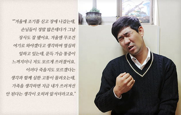 사실 임명수 씨는 이미 오래 전부터 심한 가슴 통증과 어지럼증에 시달리고 있었는데요. 쓰러진 직후 병원으로 실려갔지만, 병원에서도 특정한 원인을 밝혀내진 못했습니다. 계속된 치료와 상담을 거친 후 내려진 결론은 '과로와 우울증으로 인한 가슴 통증'이라는 진단이었습니다. 퇴원 후에도 일을 하며 지속적인 치료를 받았지만, 몸 상태는 나아질 기미가 보이지 않았고 결국 임명수 씨는 어머니의 만류로 장사를 그만두게 되었습니다.