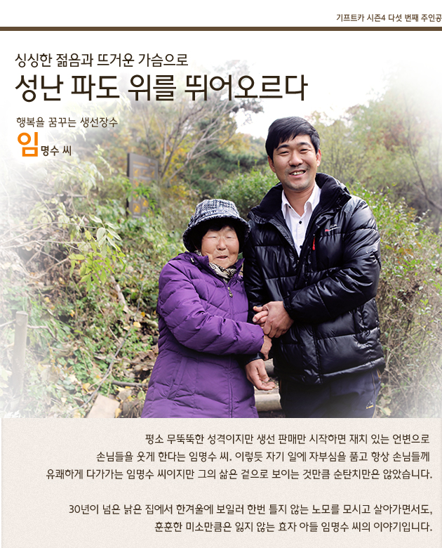 생선판매 비수기에도 각종 나물과 참외, 사과, 수박 등 계절과일이나 채소를 판매했고, 들쭉날쭉했던 수입도 조금씩 자리를 잡아갔습니다. 평균 소득은 월 150만 원 정도였지만, 이제껏 해왔던 일들과는 달리 훨씬 큰 보람을 느낄 수 있었기에 임명수씨는 하루 장사를 끝내고 나면 목이 쉴 정도로 열심이었습니다. 그렇게 열정적으로 일하던 임명수 씨는 급작스럽게 쓰러지고 말았습니다.