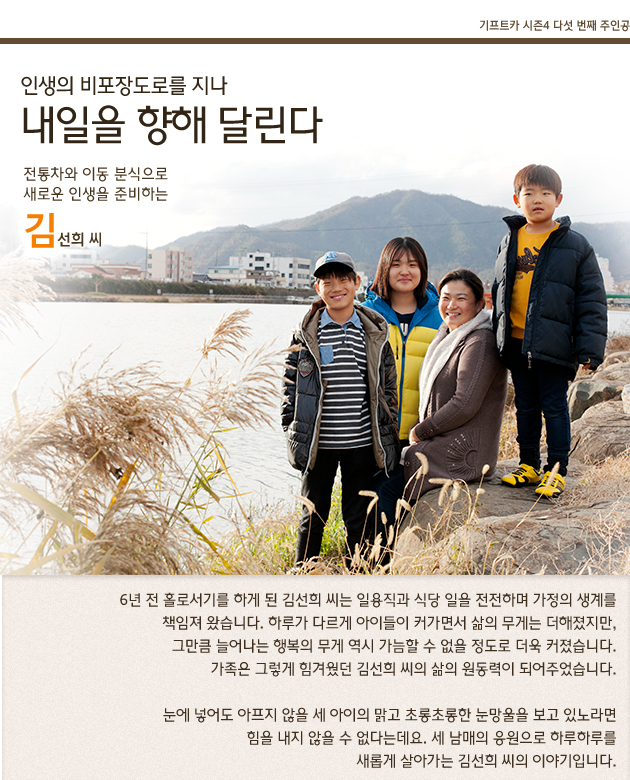그녀는 기프트카를 기다리는 지금이 가장 행복한 순간이라 말합니다. 홀로 세 아이를 키우며 수많은 불안감과 걱정에 휩싸여 살아왔던 시간을 딛고, 이제 다시 새로운 희망을 향해 도약할 수 있을 것 같다는데요. 기프트카와 함께 경제적 안정을 찾으면 아이들에게 조금 더 힘이 되는 엄마가 되고 싶고, 또 딸에 대한 걱정으로 하루도 편할 날이 없었던 친정어머니께도 기쁨을 드릴 수 있을 것 같아 무척이나 뿌듯하다고 합니다. 가족과 함께 소소한 행복을 만들며 살아가고 싶다는 김선희 씨의 간절한 소망이 꼭 이루어질 수 있기를 기프트카가 함께 응원하겠습니다.