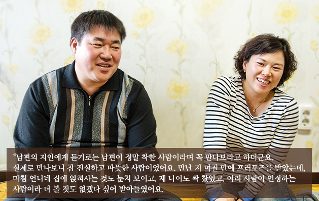 만남에서 결혼까지 단 18일. 놀라울 정도로 짧은 시간이었지만, 부부간의 신뢰와 애정이 반드시 만난 시간에 비례하는 것은 아니었습니다. 고정수입이 없던 탓에 작은 월세방에서 시작한 신혼살림은 아내의 쌈짓돈으로 두세 달 생활해야 할 만큼 어려웠지만, 서로에 대한 믿음만큼은 흔들리지 않았습니다. 한결같이 남편을 믿고 응원해 준 아내 서영선 씨 덕분에 이기림 씨는 창호 시공 회사에 취직했고, 많지 않지만 안정적인 월급도 아내의 손에 쥐여줄 수 있었습니다.