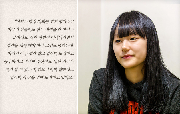 특히 성악을 전공하는 첫째 딸 예원이의 꿈을 위해서는 적지 않은 학비가 필요했는데, 도저히 그럴 여유가 없어 '그만두게 해야 하나'라는 생각까지 들었습니다. 그러나 이기림 씨는 예원이의 선생님께 자신의 ‘개인 비용을 들여서라도 가르치고 싶은 아이’라는 이야기를 듣고, 아버지로서 아이의 꿈과 재능을 키워주지는 못할망정 꺾지는 말자 생각하며 다시 이를 악물었습니다.
