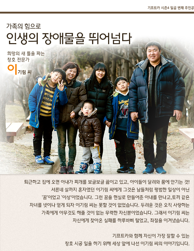 가족의 사랑으로 다시 일어선 이기림 씨. 이제 잠시 접어두었던 날개를 다시 펴고, 네 아이와 아내 앞에 당당한 가장으로 우뚝 설 시간입니다. 기프트카가 이기림 씨의 앞날을 응원합니다!