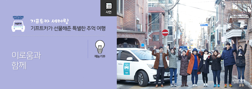 누구나 신청하고 이용할 수 있는 모두의 차 ‘기프트카 셰어링’. 2014년 11월부터 진행되고 있는 이 캠페인을 통해 기프트카는 오늘도 부지런히 전국 방방곡곡을 달리고 있답니다. 재능기부, 멘토멘티, 실버봉사, 좋은이웃, 고무신 중 본인의 셰어링 활동에 맞는 테마를 선택해 오는 2월 13일까지 기프트카 홈페이지에서 신청할 수 있습니다.