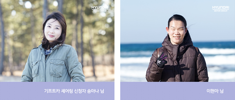 송아나 님 : 몇 달 동안 흩날리다 프로젝트를 진행해오면서 멤버들이 무척 친해졌어요. 새해가 되면서 모두들 여행을 가고 싶어 했는데, 자동차 마련이 엄두가 안 나 꿈만 꿔오고 있었죠. 그러다 우연히 영화관에서 기프트카 셰어링 광고를 보고 반신반의하며 신청했는데 뽑혔다는 소식에 모두들 얼마나 좋아했는지 몰라요. 차를 받고 그 기쁨은 더욱 커졌습니다. 고속으로 달릴 때도 승차감이 무척 안정적이었고, 향을 다루는 프로젝트를 진행 중이라 친구들 모두 냄새에 민감한데, 기프트카는 자동차 특유의 냄새도 없이 정말 쾌적하고 안락하더군요. 기프트카 덕분에 저희의 우정이 더욱 돈독해졌습니다.