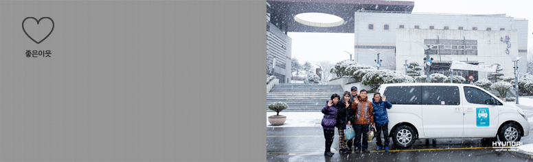 현대자동차 그룹의 캠페인 '기프트카 셰어링’이 소외된 이웃에게 한 편의 동화 같은 추억을 만들어주고 있습니다. '누구나 이용할 수 있는 모두에 차'라는 주제로 따듯함을 나누려는 사람이라면 누구나 멘토멘티, 좋은이웃, 실버봉사, 재능기부, 고무신 중 테마를 선택해 2월 13일까지 기프트카 홈페이지에서 신청할 수 있습니다.