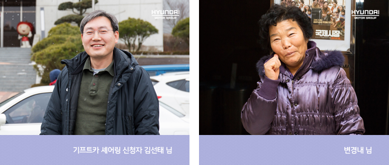 김선태 님 : 작은영화관을 세우고 나니 시골에 계신 어르신과 아이들이 보였습니다. 영화관이 있어도 이동이 쉽지 않아 영화 한 편 보는게 쉽지 않은 상황이었어요. 차량이 필요했지만, 차량지원을 위한 예산확보가 어려웠고요. 그러던 중에 ‘현대차 기프트카 셰어링’ 의 문을 두드리게 됐습니다. 기프트카 셰어링을 통해 영화를 보시고 좋아하는 모습을 보니 마음이 뿌듯해집니다.