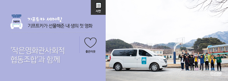 장수군에서는 영화관이 있어도 영화관까지 갈 수 있는 버스는 하루에 단 세 차례만 운행하고, 이동시간도 1시간이나 걸려서 마땅한 이동수단이 없는 어린이들과 어르신들은 영화관람은 쉽지 않았다고 하는데요. 영화 한 편 맘편히 볼 수 없었던 우리 이웃들을 위해 기프트카 ‘스타렉스’와 작은영화관협동조합이 출동했습니다.