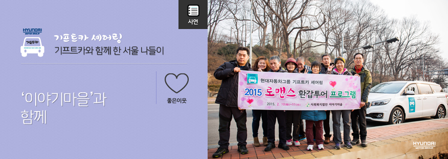 이곳에서 어르신들을 돌보고 있는 김명희 님은 환갑을 맞은 어른들께 특별한 선물을 드리고 싶어 고민에 빠져 지냈답니다. 그러다 우연히 TV 광고를 통해 ‘기프트카 셰어링’을 접하고 가장 특별한 선물이 떠올랐지요. 바로 ‘기프트카 셰어링과 함께하는 서울 나들이’입니다.
