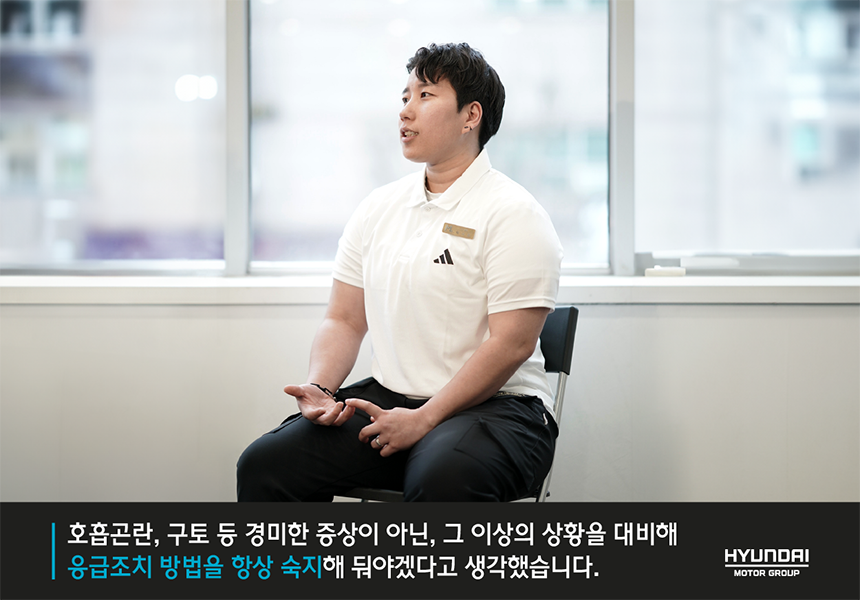 A. 동료 트레이너들과 다 같이 응급 안전 교육을 받아야겠다고 결심은 했지만, 근무시간과 스케줄이 조금씩 다르다 보니 시간을 맞춰 함께 교육센터에 가기가 힘들었어요. 그런데 이렇게 제가 있는 곳까지 기프트카가 찾아오다니 얼마나 편한지 몰라요. (웃음) 이보다 더 정확하고 간편하게 응급 안전 교육을 받을 기회가 있을까요? 정말 좋은 캠페인이라고 생각하고, 앞으로도 응급 안전 교육이 필요한 사람들에게 더욱 많은 기회가 있으면 좋겠습니다.