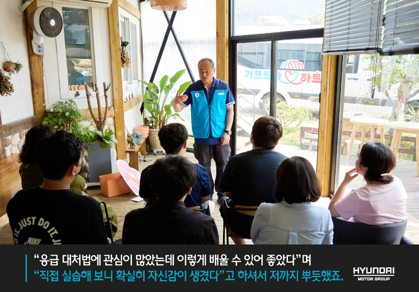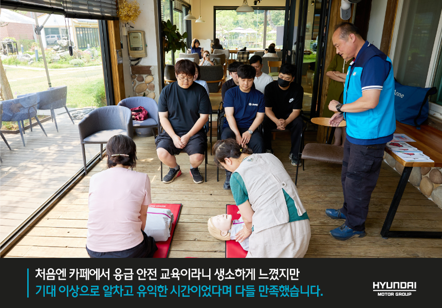 A. 우선 이 자리를 빌려 이런 좋은 캠페인을 운영해 주시는 현대자동차그룹과 대한적십자사 관계자분들께 감사 인사를 드립니다. 무더운 날씨에도 이곳까지 한달음에 찾아와 응급 안전 교육을 전해주신 덕에 저를 포함한 직원들과 손님들이 편안하게 ‘안전 예방주사’를 맞을 수 있었습니다. 예방 접종을 마친 만큼 안전사고 예방에 더욱 관심을 갖고 힘쓰겠습니다. 기프트카 하트비트가 전 국민에게 안전 예방주사를 놓는 그날까지 진심으로 응원하겠습니다.