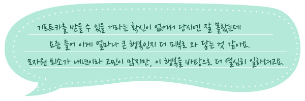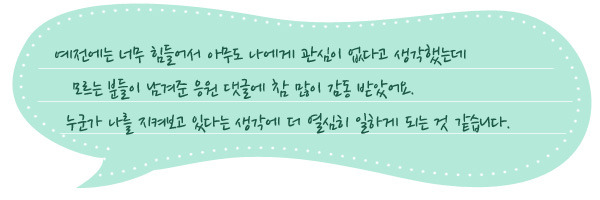 기프트카 캠페인은 이정동 씨의 마음가짐도 변화시켰습니다. 실패에 대한 두려움이 컸던 예전과 달리, 블로그에 남겨진 응원 댓글을 읽으며 자신감을 회복할 수 있었다는데요. 현재 월급의 1/3이 채무변제에 들고 있지만, 조금만 더 노력하면 자립할 수 있다는 희망도 생겼습니다. 이정동 씨 부부는 이 자립의 희망을 꿈꾸며 늘 긍정적인 생각만 하면서 살아가려 노력 중입니다.