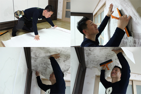 [꼼꼼한 솜씨로 벽지를 바르는 김대원 씨]