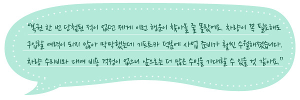 ‘집수리&인테리어 러블리하우스’라는 로고가 선명하게 새겨진 양경애 씨의 기프트카는 사업에 가장 큰 보탬이 되고 있습니다. 상호와 잘 어울리는 핑크색 로고는 이번 기프트카 시즌3에 새롭게 추가된 상호 및 로고 개발 지원으로 제작된 것인데요. 멀리서도 눈에 띄는 선명한 로고 덕분에 홍보효과도 톡톡히 누리고 있습니다. 무엇보다 꼭 필요했던 새 차가 생긴 덕분에 무거운 작업 도구를 실어 나르기도 수월해졌고, 원거리의 작업장까지 신속하게 이동할 수 있는 기동성이 확보되었습니다. 겨울철이면 집수리와 인테리어 수요가 많지 않아서 사업 초기 비용과 차량 구입에 대한 부담이 더 커지게 마련인데요. 기프트카의 든든한 지원으로 차량구입비와 등록비, 차량 구입에 따른 세금과 보험료를 해결할 수 있게 되었습니다.