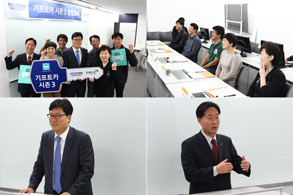 기프트카 시즌3 두 번째 창업교육은 지난 10월 9일부터 11일 까지, 사흘 동안 진행되었습니다. 11월의 주인공으로 선정된 5인은 창업교육을 위해 서울시 서대문에 위치한 현대차미소금융재단 미소학습원에 모였습니다. 교육 첫날에는 창업자 역량 교육, 성공 사업자 특강, 비즈니스 코칭과 한 시간 가량의 개인코칭이 그들을 기다리고 있었는데요. 이동식 분식점에서 막걸리 유통업까지 주인공마다 창업 아이템이 모두 다른 만큼, 교육 프로그램은 개인별 맞춤교육의 형태로 실시됐습니다. 주인공들은 강의 내용을 놓치지 않고 필기하면서 교육에 열중했습니다.