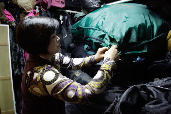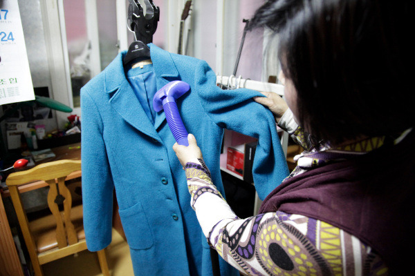 [세탁한 의류를 손질하는 황귀순 씨의 모습]