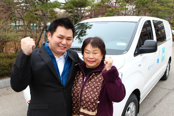 [창업 성공의 꿈을 이뤄줄 기프트카와 환하게 웃음 짓는 종성 씨와 어머니]