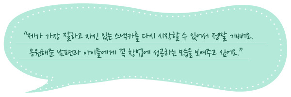 갑작스럽게 어려워진 형편은 영숙 씨와 가족들을 더욱 단단히 뭉치게 만들었습니다. 남편의 병원비와 가족의 생계를 위해서 일하는 그녀를 대신해 두 자녀가 학업과 아버지의 병간호를 병행하며 어머니를 도왔습니다. 또한 방학 기간 동안에는 아르바이트를 하며 한 푼 두 푼 모은 돈을 생활비에 보태기도 했습니다. 공부에 집중해야 할 시기에 아이들에게 무거운 짐을 짊어지게 한 것 같아 미안함이 컸던 영숙 씨. 힘든 내색 없이 되려 영숙 씨를 위로하고 응원하는 자녀들을 보며 그녀는 더이상 두 자녀에게 짐이 될 수 없다는 생각에 다시 한 번 가장 자신 있는 스낵카 창업을 마음먹었습니다.