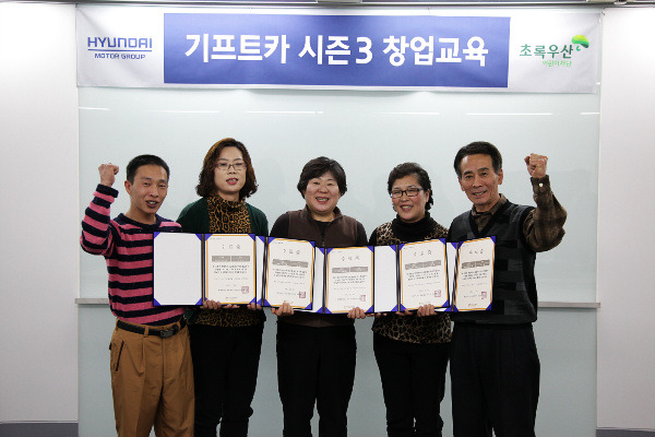 창업교육 마지막 날, 2박 3일간의 교육을 마치고 본격적인 창업에 뛰어들 다섯 주인공을 축하하기 위한 자리가 마련됐습니다. 축하행사는 다섯 주인공 외에도 현대자동차그룹과 어린이재단 임원들이 참석한 가운데 진행되었습니다.