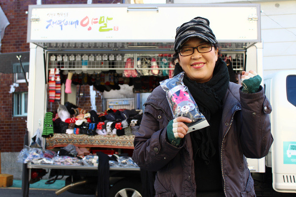 판매 장소를 결정한 뒤, 용숙 씨는 기프트카 창업지원금을 활용해 대구에서 판매할 상품을 구입했습니다. 수백 가지가 넘는 양말과 스타킹, 속옷, 방한모 등은 모두 그녀가 직접 품질과 스타일을 기준으로 꼼꼼히 살펴 선택한 것입니다. 재고 상태로 오래 보관된 양말은 햇빛에 색이 바래거나 발목 부분의 고무밴드가 삭을 위험이 있으므로 한꺼번에 너무 많은 양을 구입하지 않는 것이 그녀의 원칙인데요. 계절과 수요에 따라 소량씩 다양한 상품을 구비하고 오래된 양말은 덤 상품으로 제공해 물품 회전율을 높일 계획이라고 합니다.