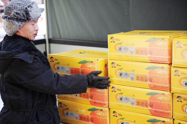[감귤상자를 기프트카 적재함에 싣는 신영민 씨의 모습]