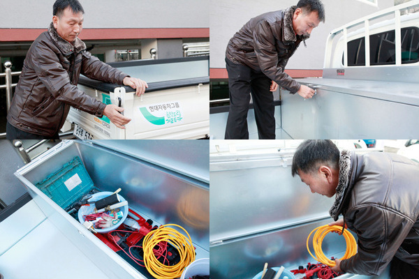 [차량 적재공간에 설치된 공구함에서 작업에 필요한 자재를 꺼내는 모습]