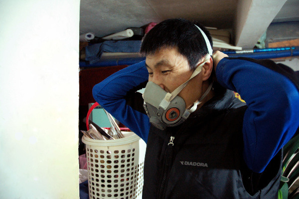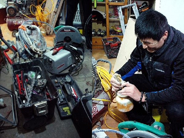 [실내 인테리어 시공에 필요한 장비들과 장비를 손질하는 이인규 씨의 바쁜 손놀림]