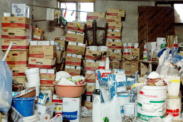 [부도난 사업 정리 후 이인규 씨가 보유하게 된 수백 통의 페인트들]