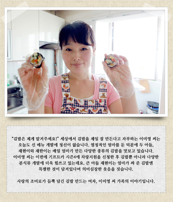 재현이와 재한이는 오늘도 엄마를 도와 김밥재료를 준비하고 있습니다. 기장군청의 소개로 현대자동차그룹의 기프트카에 지원한 엄마를 돕기 위해서입니다. 미영 씨도 일일 아르바이트로 마트와 분식점에서 일을 하고, 쉬는 날이면 김밥의 신 메뉴를 개발하는 데 전력을 쏟고 있습니다. 서류심사와 면접심사에서 좋은 결과를 얻기 위해서는 새로운 메뉴를 개발하는 것이 필수라고 생각한 것입니다. 그런 엄마의 노력에 두 아들은 새로운 아이디어를 내보기도 하고 다양한 모양을 만들며 엄마를 돕고 있습니다.