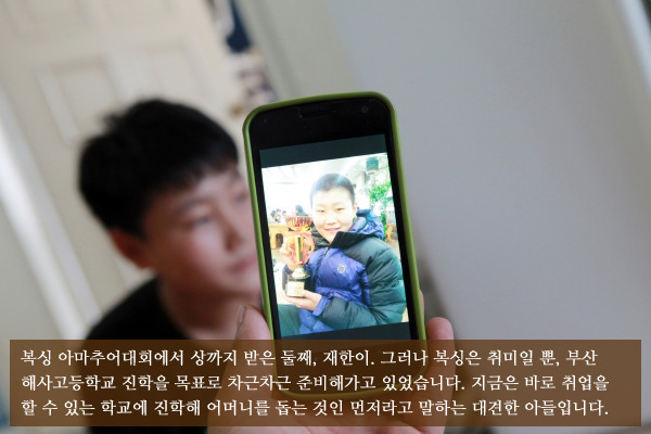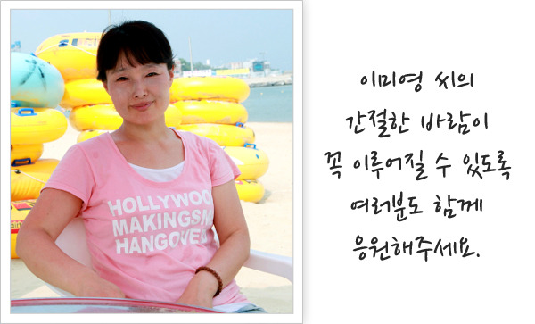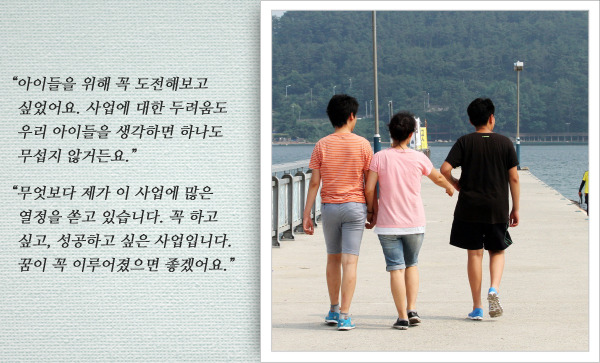 이미영 씨는 아이들 아빠가 떠났을 때, 어떻게든 너희들을 지켜주겠노라고 약속했습니다. 하지만 여자 혼자 두 아들을 키운다는 것은 여간 힘든 일이 아니었습니다. 육체적으로나 정신적으로 한계를 느껴 포기하고 싶은 적도 많았다고 합니다. 그러면서도 일용직 아르바이트를 꾸준히 하며 빠듯한 살림이나마 꾸려나갈 수 있었고, 어느새 장성한 두 아들은 엄마에게 든든한 지원군이 되어 있었습니다.