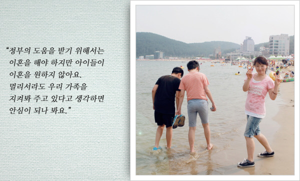 언제나 부족하기만한 자신을 믿고 따라주는 아이들에게 미영 씨는 엄마로서 해주 싶은 것들이 많습니다. 글쓰기를 좋아하는 재현이에게 책도 많이 사주고 싶고 복싱을 곧 잘하는 재한이에게 아낌없는 지원을 해주고 싶습니다. 그러나 생활비조차 부족한 상태라 아이들 교육비 지출은 꿈도 꾸지 못합니다. 혹시 정부보조금을 받을 수 있지 있을까 싶어 알아봤지만 남편과 이혼을 하지 않아 도움도 받지 못하고 있는 상황입니다.
