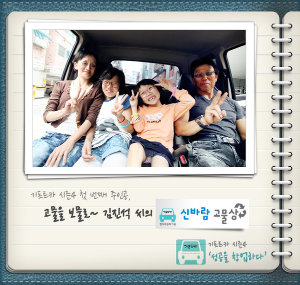 김진석 씨: 기프트카를 받기 전까지 정말 많이 긴장했었어요. 그런데 딱 받고 나니 긴장감이 열정으로 샘솟는 것 같았습니다. 가만히 앉아 있을 수가 없어서 지금까지 기도하고 응원해준 아내와 경민이, 강민이를 데리고 소래포구에 가서 바람도 쐬고 아이스크림도 하나씩 먹고 왔습니다.